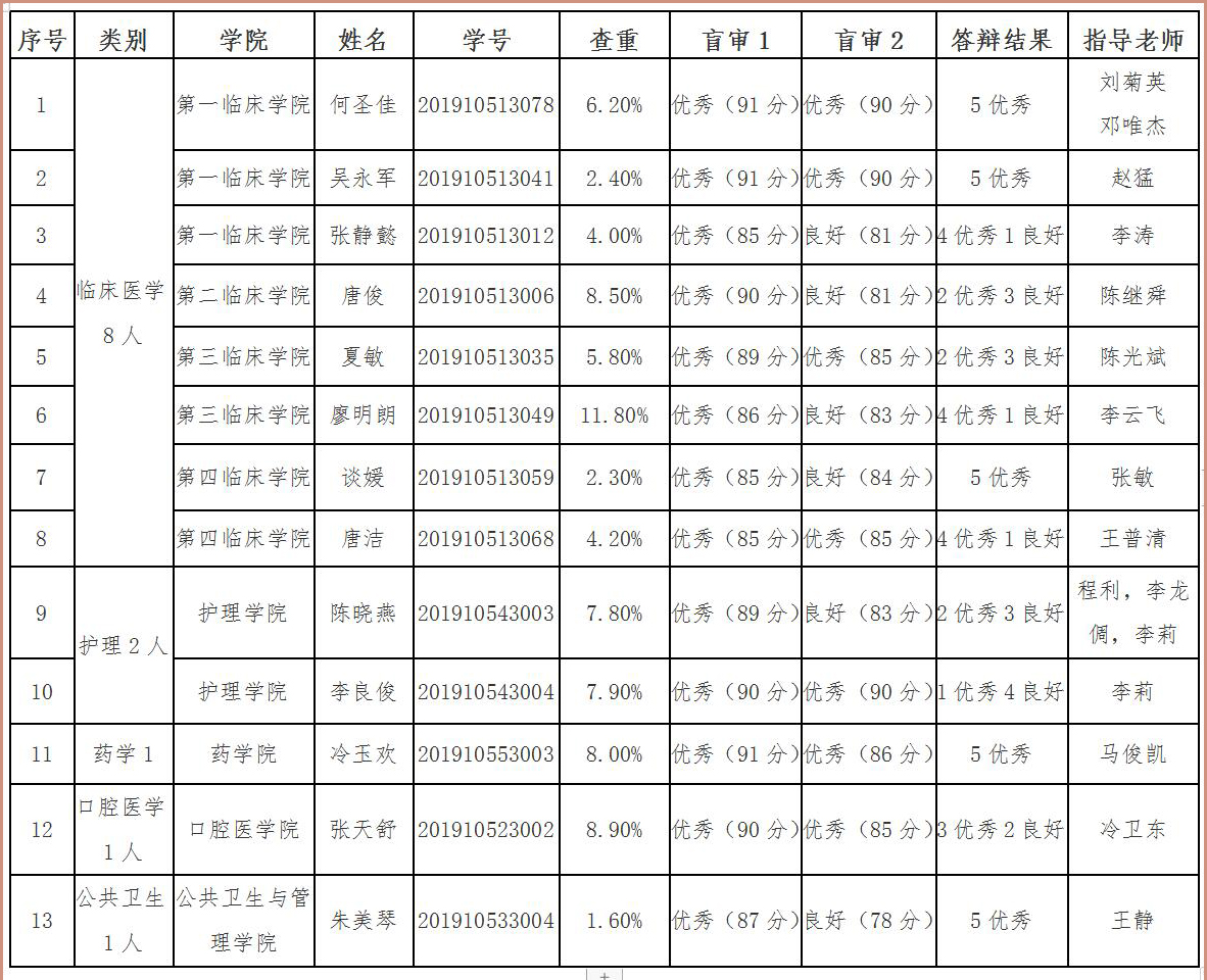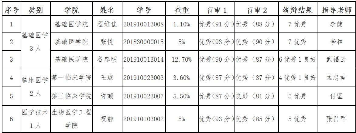 根据《湖北医药学院硕士研究生优秀学位论文评选办法》,研究生院按照“学硕优秀学位论文数不超过当年学硕学位论文数的15%,专硕优秀学位论文数不超过当年专硕学位论文数的10%”的比例切分指标到学院,各学院学位评定委员会评审、公示后向研究生院提交推荐名单,研究生院复核后评选出2022年度硕士研究生优秀学位论文共19篇,名单如下: