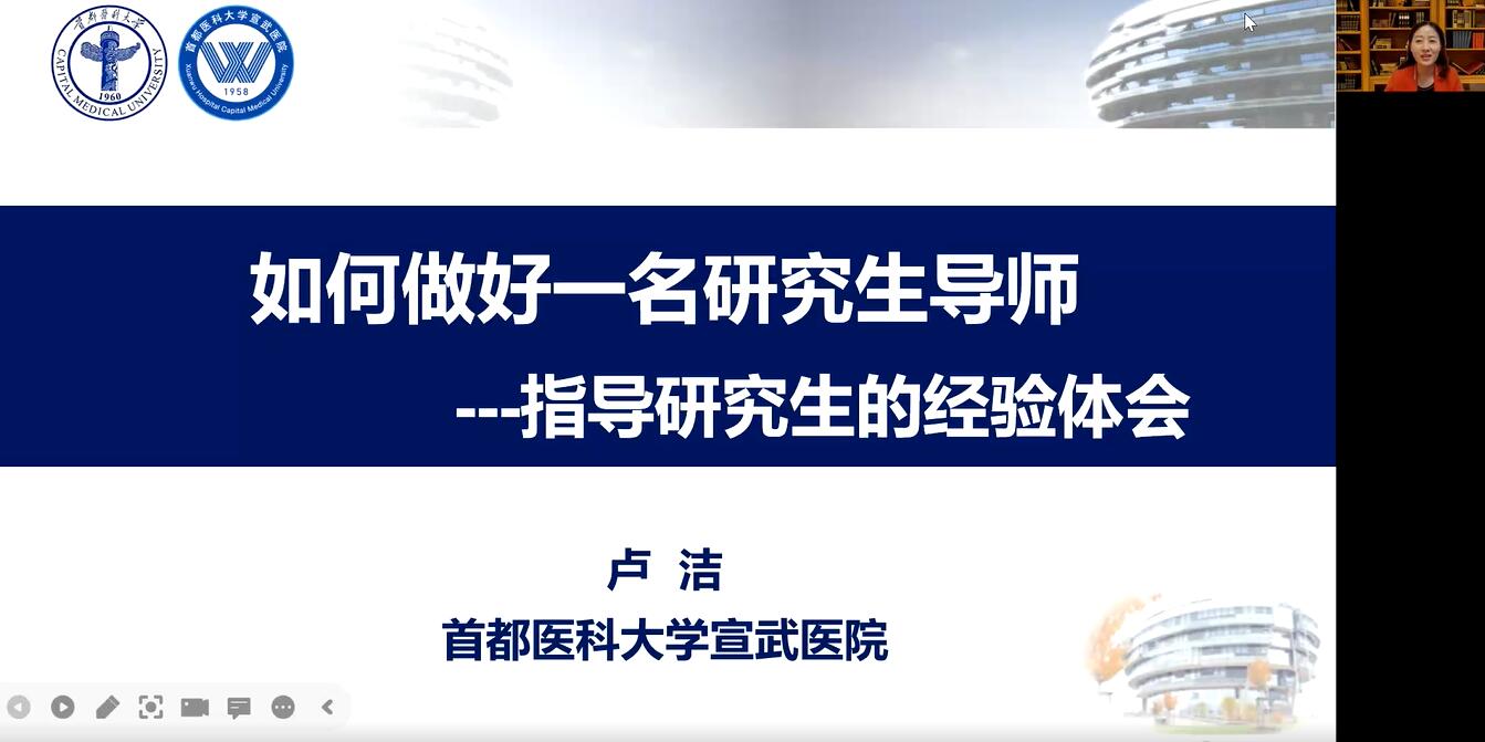 首都医科大学研究生院专职心理咨询师来源作题为《研究生心理健康与导学关系》的专题报告,她从分析新一代研究生的心理特征入手,围绕研究生培养过程中的关节环节,提出辨识潜在心理健康风险的十条原则,并向导师提供日常访谈的技巧和方法,为导师尽早发现学生心理问题提供帮助。