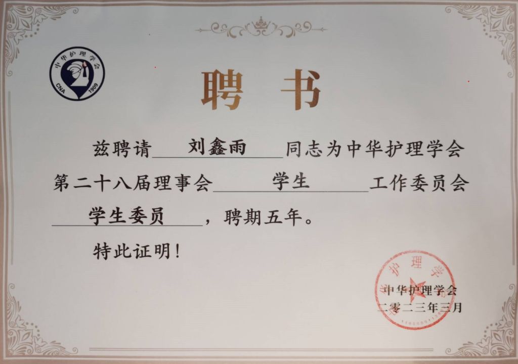 支部党员2022级硕士研究生刘鑫雨当选为中华护理学会第二十八届理事会学生工作委员会学生委员。中华护理学会学生工作委员会是中华护理学会为对接国际护士会护理学生指导小组成立,可加速我国护理人才储备,加强护理学生与中华护理学会有效沟通与接触,提升护理学生在护理政策对话中的参与度。