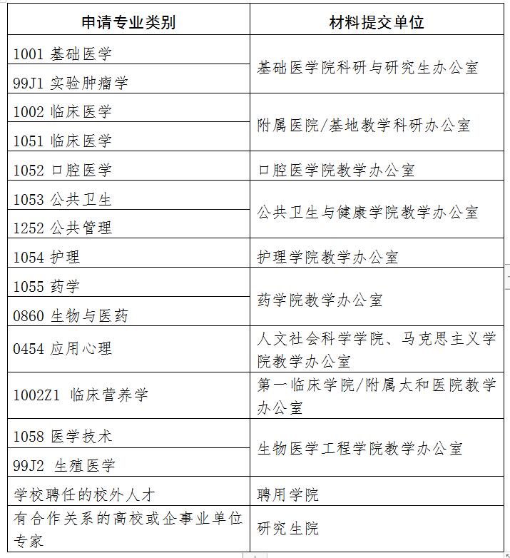 (1)学校下发通知开展硕士生导师遴选工作。符合条件的申请人准备相关申报材料,将纸质材料和电子材料递交至所属学院/单位(具体见下表;各学院/单位可自行确定材料提交截止时间),材料清单如下: