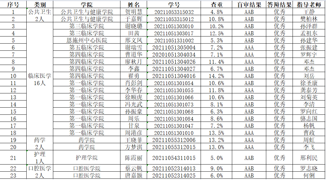 根据《湖北医药学院硕士研究生优秀学位论文评选办法》,研究生院按照“学硕优秀学位论文数不超过当年学硕学位论文数的15%,专硕优秀学位论文数不超过当年专硕学位论文数的 10%”的比例切分指标到学院,各学院学位评定委员会评审、公示后向研究生院提交推荐名单,研究生院复核后评选出2024年度硕士研究生优秀学位论文共33篇,名单如下: