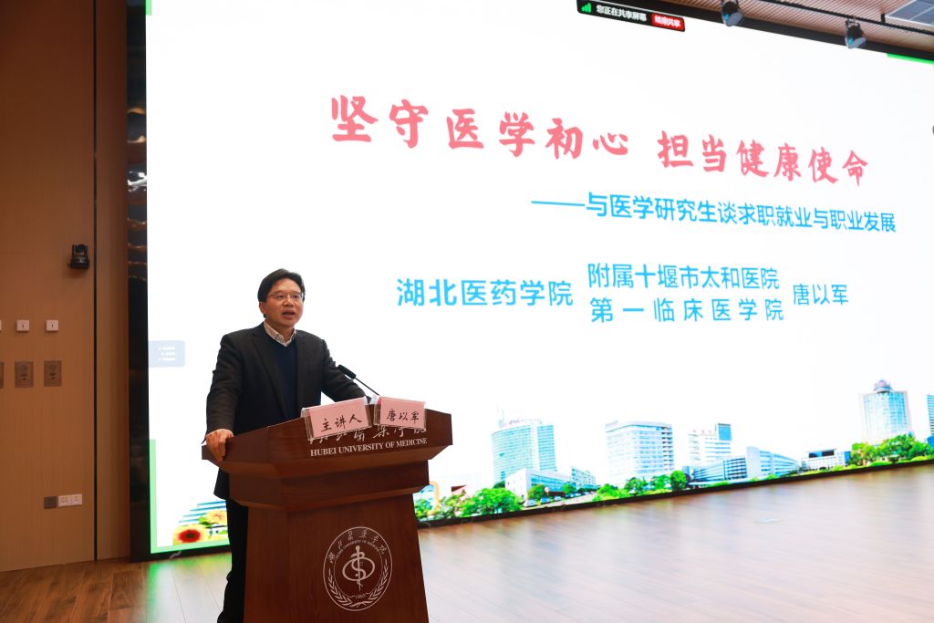 附属太和医院党委副书记 院长唐以军作题为《坚守医学初心担当健康使命》的专题报告,讲解了当前医疗卫生行业的就业形势,指出医学生所面临的就业压力和机遇,报告了各级医院当前的人才需求,并结合公立医院招聘的要求和程序,指出毕业生在求职过程所表现出来的一系列共性问题,并从简历制作、着装仪态、自我介绍、知识储备、团队合作、沟通交流等方面做具体指导。同时,列举身边优秀典型代表们的职业发展情况,指出医学生存在的职业发展方向,并结合国家有关促进高质量充分就业的政策、新时代我国居民健康需求特征、健康中国战略、两层六级整合型医疗卫生服务体系蓝图等政策和导向,引导毕业生拓宽眼界、找准定位,在医疗有关领域多元化、高质量就业。
