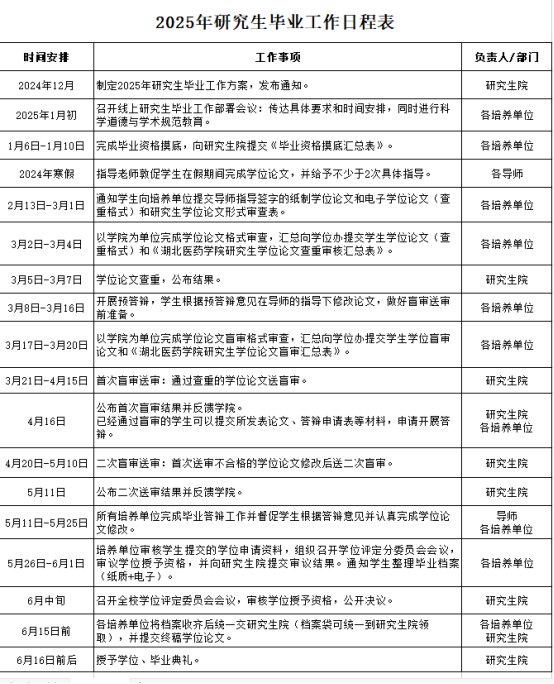 根据《中华人民共和国学位条例暂行实施办法》和《湖北医药学院硕士研究生学位授予规定》,现对2025年研究生毕业工作安排如下,请各培养单位、硕士生导师、2025届预毕业研究生严格按要求执行。