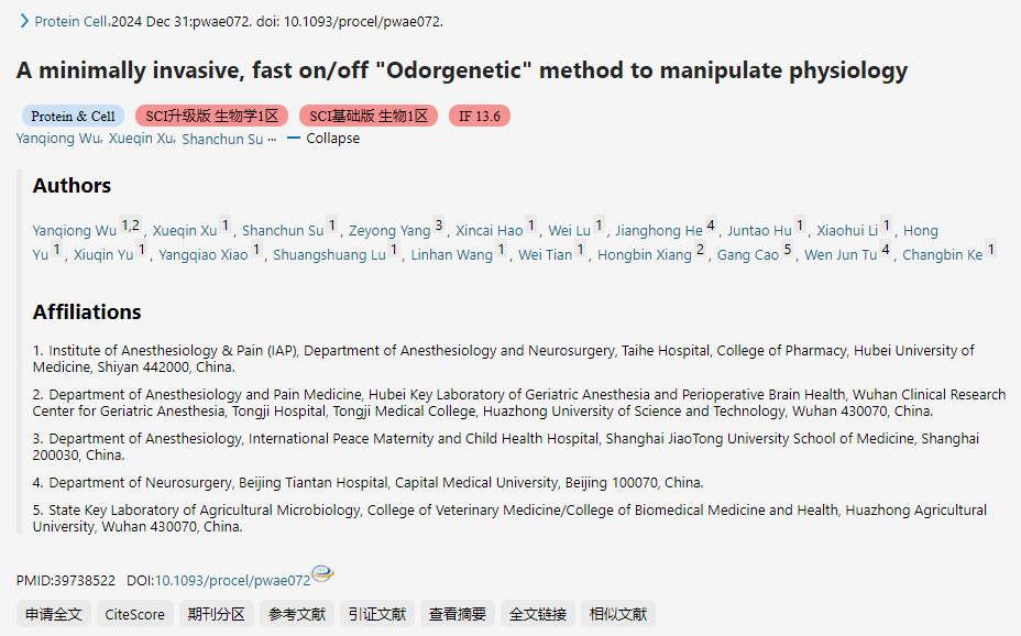 麻醉疼痛研究所柯昌斌团队研发的气味遗传学技术发表高质量SCI论文