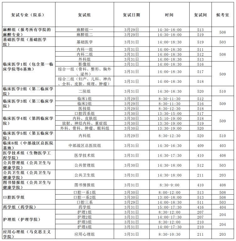 现将各学院(学科)复试时间和地点公布如下,请考生提前做好复试准备,按通知的时间节点抵达候考室,候考室和复试间均在我校临床技能中心2-5楼。