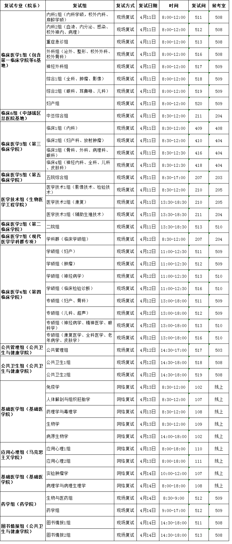 现将各学院(学科)复试时间和地点公布如下,请考生提前做好复试准备,按通知的时间节点抵达候考室,候考室和复试间均在我校临床技能中心2-5楼。网络远程复试的考生请根据报考院系的管理老师安排,按时参加复试系统的连线测试,确保设备正常运行。